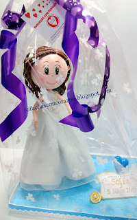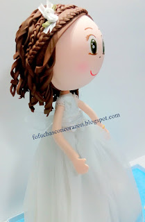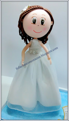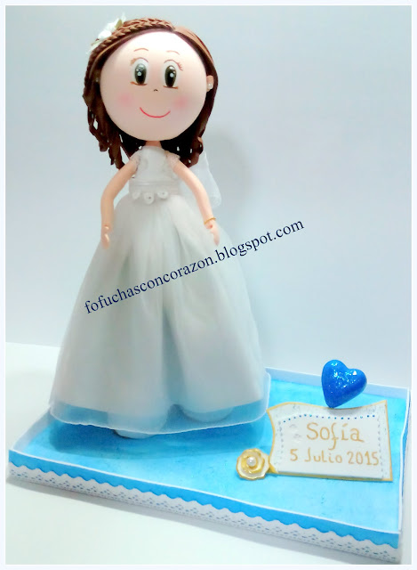 Es una fofucha de comunión para Sofía, una niña que recibió su primera comunión el 5 de julio. Ha sido un regalo de su familia para ella, y se la hemos hecho super rápido, según las fotos que nos hizo llegar su madre, para que la recibiera ese día tan especial.