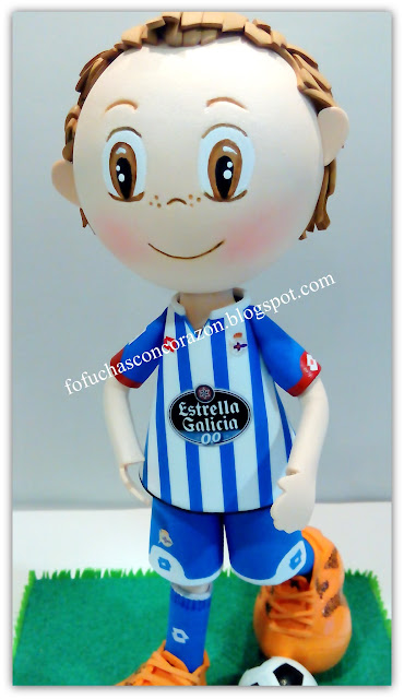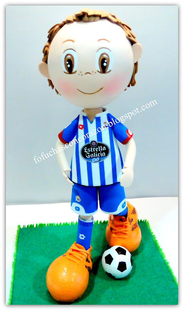 a continuación podéis ver el fofucho más detalladamente: primera equipación deportiva del R.C Deportivo de la Coruña, botas personalizadas, nombre, las pecas en su cara,