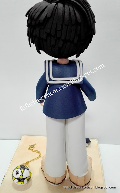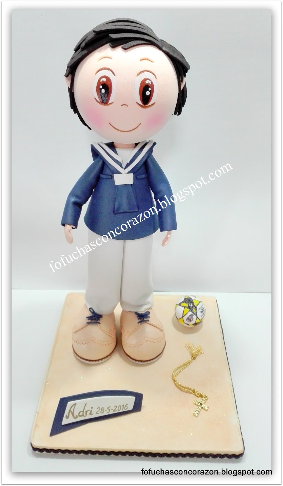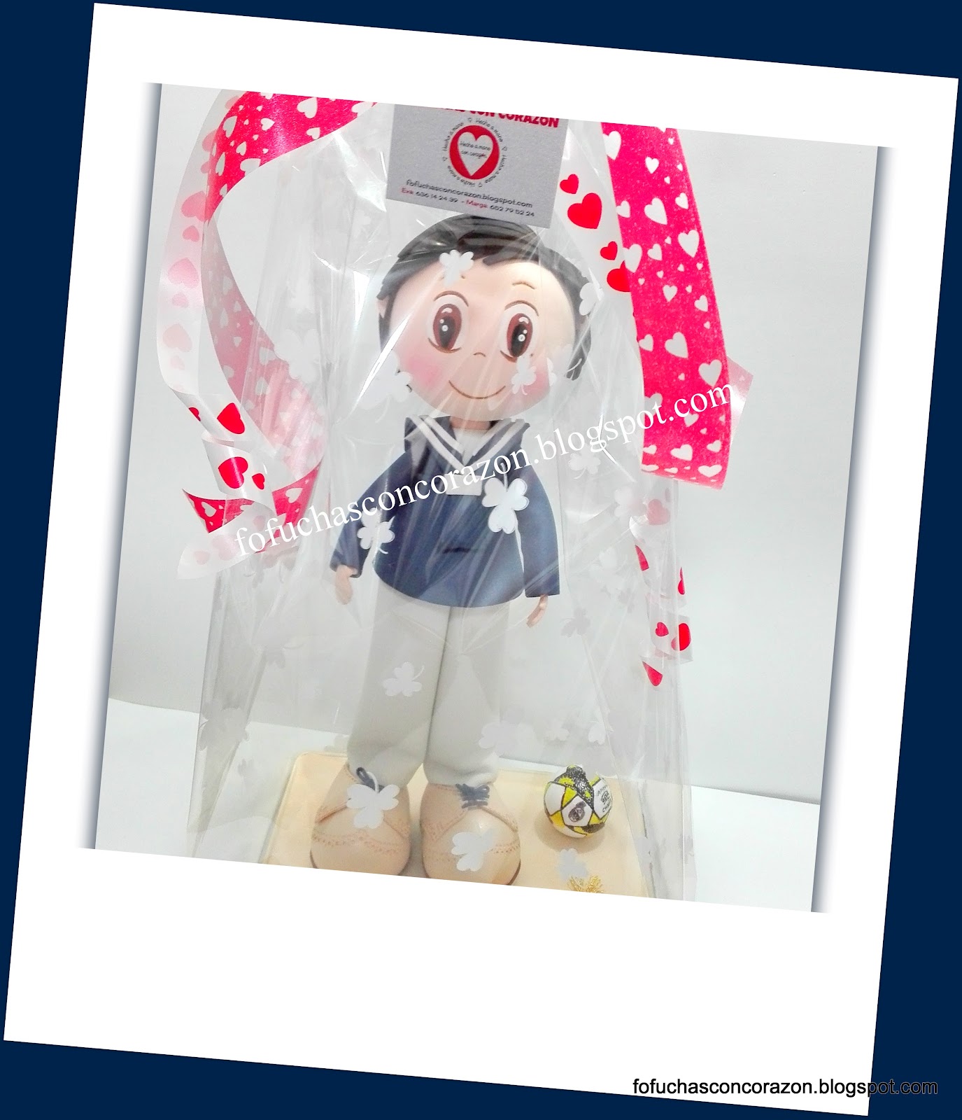 Ha recibido su primera comunión el pasado 28 de mayo, y su madrina Inés, ha querido regalarle este precioso fofucho, y para que se lo personalizaramos nos envió las fotos necesarias y muchas ideas.